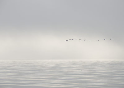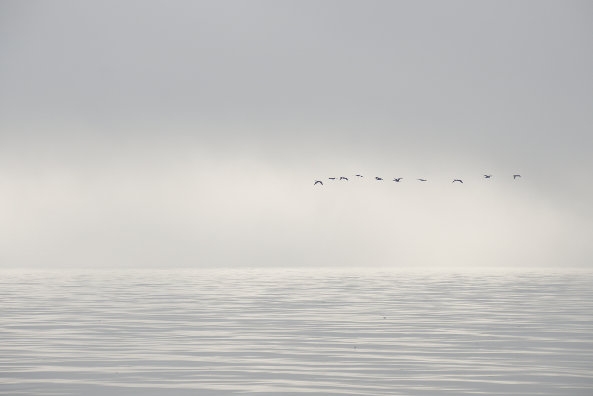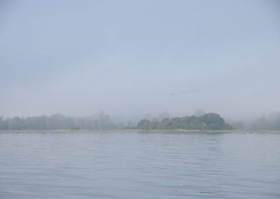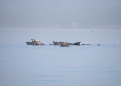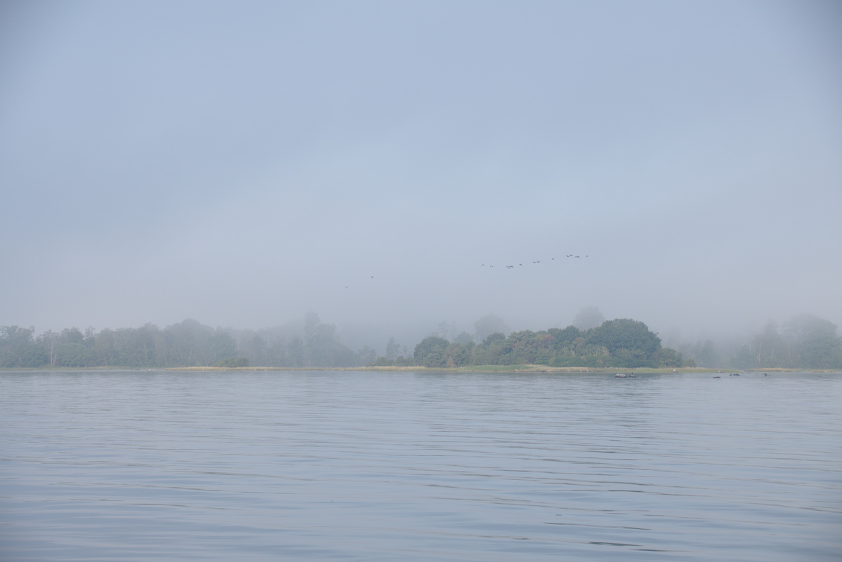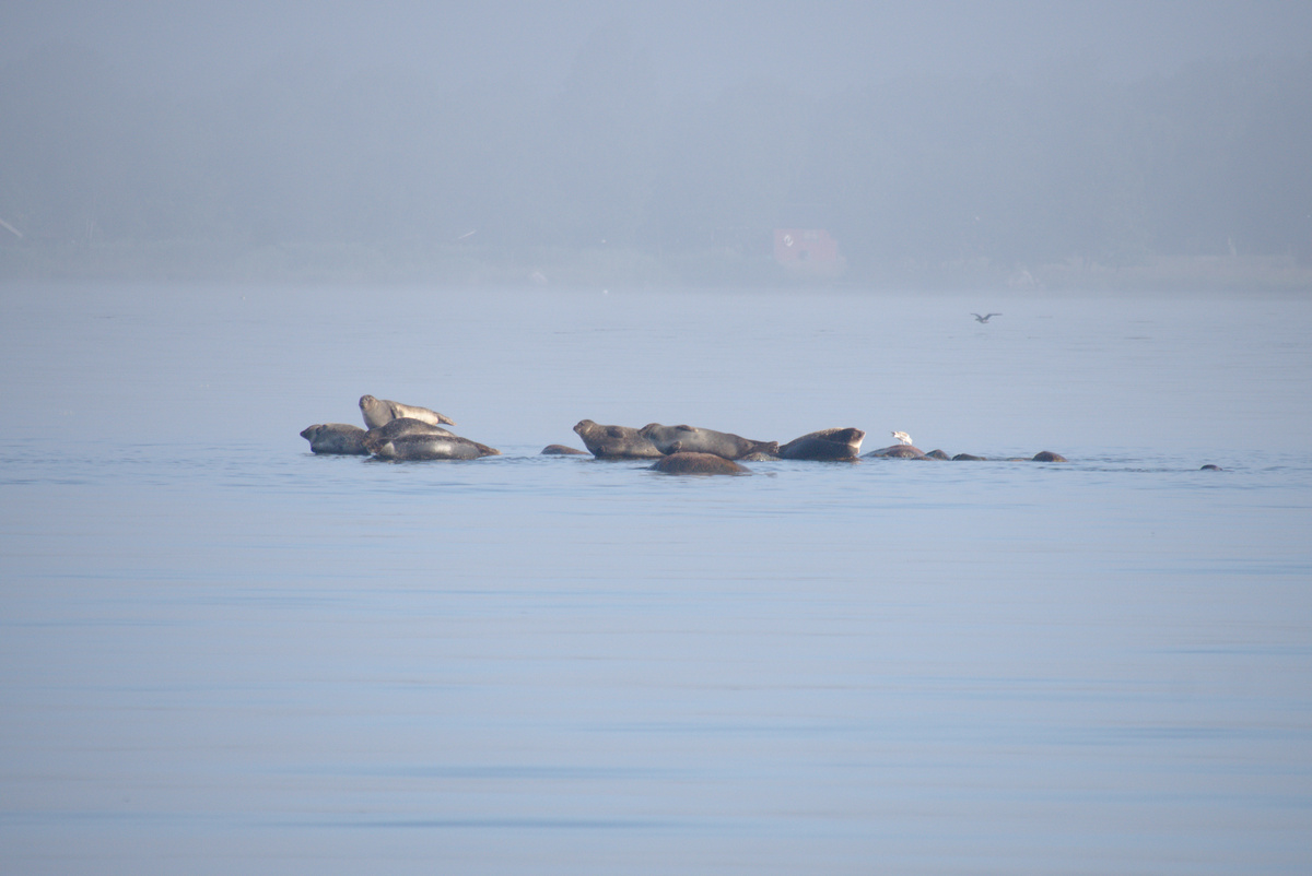 Abends ließen wir den Anker gegen 20:45 Uhr in einer Bucht in der Nähe von Bergkvara fallen. Die Ankerleine führten wir nach vorne an den Bug. So dreht sich das Boot in den Wind und im Cockpit sitzt man geschützter. Weiter entfernt sahen wir einige Häuser und eine Mastspitze, aber die Bucht hatten wir für uns. Es fühlte sich eigenartig an, als einziges Boot mitten auf dem Wasser zwischen Felsen zu liegen. Einige der Felsen waren für unseren Geschmack außerdem etwas zu nah. Nachdem wir einige Zeit beobachteten hatten, wie Luzie um die Ankerleine trieb, ohne dass die Felsen gefährlich nahe gekommen wären, beschlossen wir, schlafen zu gehen. Die Geräte ließen wir montiert, warme Kleidung griffbereit, den Salon soweit möglich segelklar. Falls der Anker nicht halten sollte, wären wir bereit zum Ablegen. Wir stellten uns zur Beruhigung mehrere Wecker für die Nacht, um nach dem Rechten zu sehen: Blick nach draußen, GPS-Position auf dem Plotter prüfen, Peilung am Bordkompass ablesen (Wind aus Süd-Ost war gemeldet) und wieder ins Bett schlüpfen. Unser Ankerplatz war nicht optimal gewählt, wie wir bald an den zunehmenden Wellen merkten. Nervös lauschten wir auf jedes Geräusch, das Schlagen der Wellen und Knarzen der Ankerleine, und fielen nur vorübergehend in leichten Schlaf. Christian übernahm das Aufstehen in den ersten Schichten und bewunderte dabei einen riesig wirkenden, orangen Mond und einen klaren Sternenhimmel. Miriam stand für die Frühschichten auf, sah durch dichten Morgennebel die Sonne aufgehen und entdeckte später eine schwimmende Robbe. Und dann mehrere Robben auf den nahen Felsen. Vor Begeisterung hellwach hüpfte sie barfuß über das taunasse Boot und versuchte, die zauberhafte Morgenstimmung in Fotos festzuhalten.