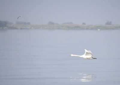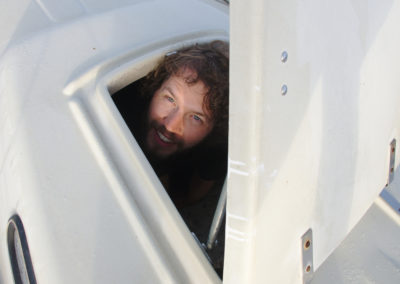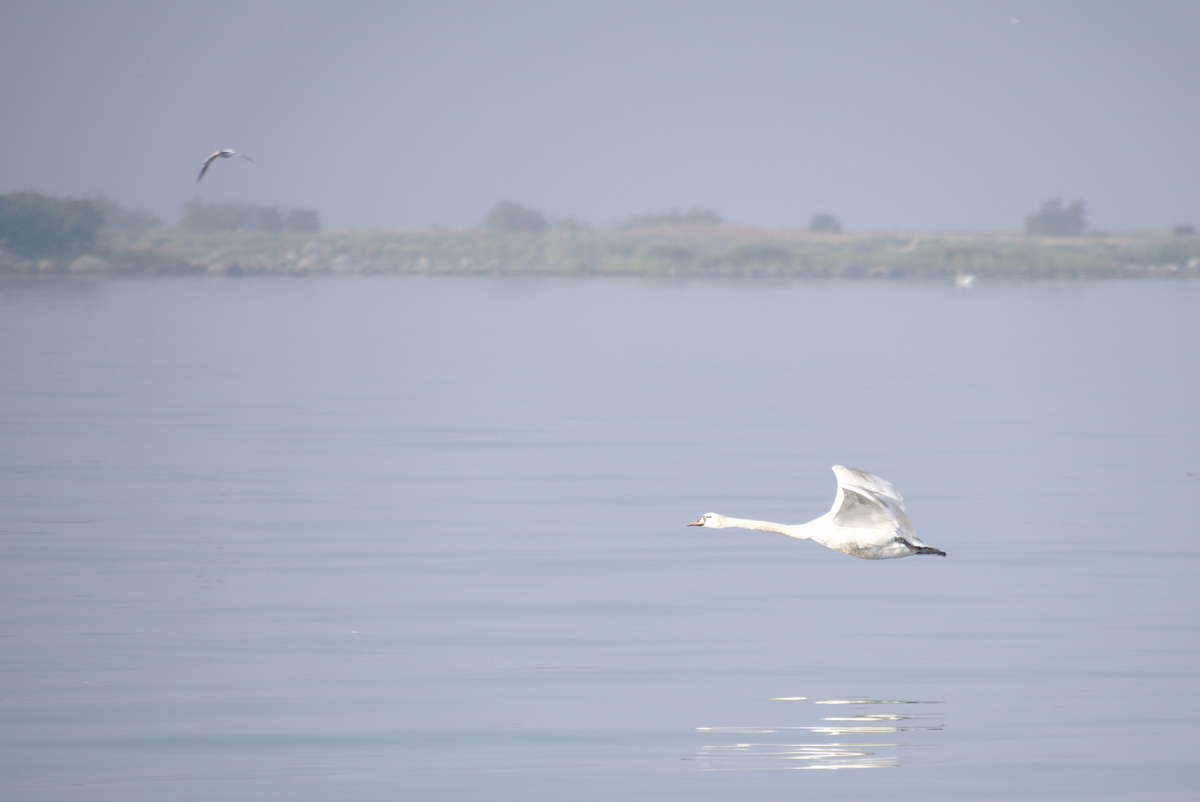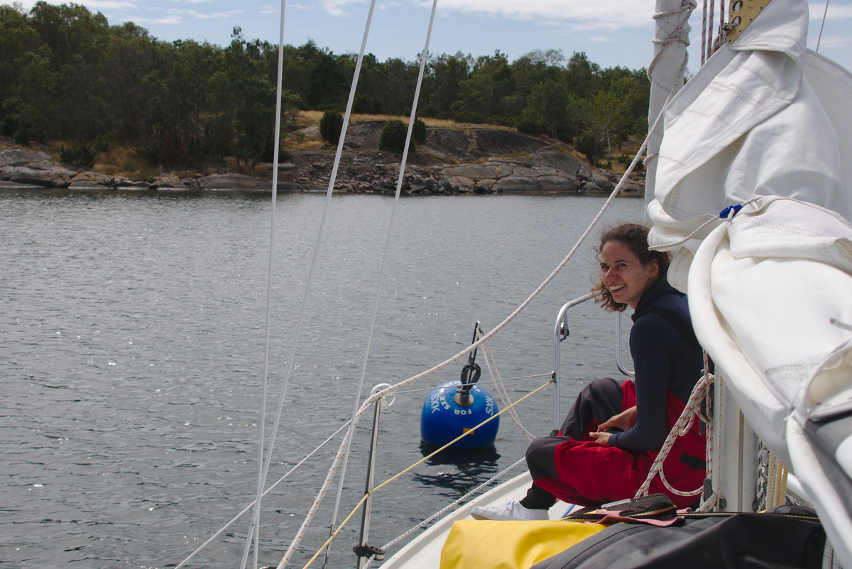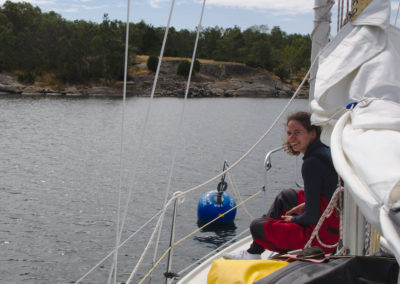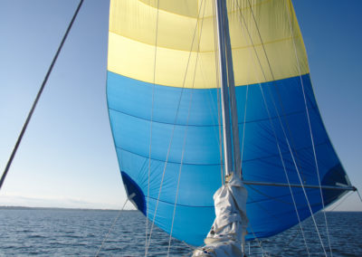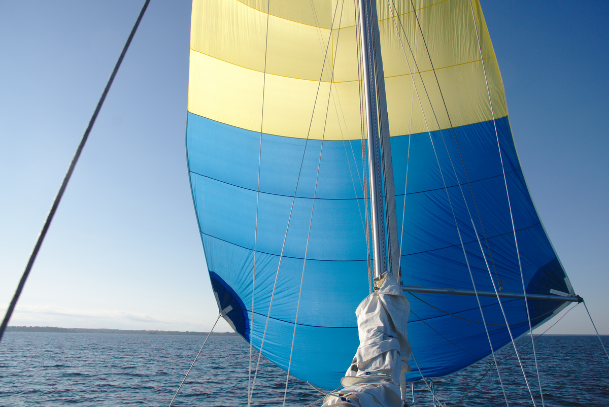 Später war der Wind günstig für einen erneuten Spinnaker-Versuch. Diesmal klappte es. Es ist beeindruckend, wie das riesige Tuch als geknäulte Säule aus dem Seesack zur Mastspitze steigt, Wind fängt und sich knisternd auffaltet, um im nächsten Moment wie ein riesiger Winddrache vor dem Boot zu stehen. Unser Spinnaker ist wahrscheinlich noch ein Original-Vega-Segel, jedenfalls wirkt er äußerst schwedisch mit seinen gelben und blauen Streifen und wir freuten uns über diesen enormen, weithin sichtbaren Schweden-Fan-Wimpel. Ein kleiner Winddreher oder Fahrfehler kann das Segel zum Einfallen bringen und wenn es sich dabei unglücklich verheddert, kann der feine Stoff reißen. Das Steuern und Trimmen des Segels forderte daher unsere ganze Aufmerksamkeit und trotz der Freude über seine Schönheit und die schnellere Fahrt waren wir erleichtert, als wir das Segel wieder sicher geborgen hatten.