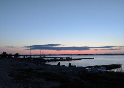 Wir wiederholten die Kontrollen mehrmals und erholten uns allmählich vom ersten Schreck. Ein dramatischer Schaden hätte sich sicher schon bemerkbar gemacht. Luzies Vorbesitzer hatte uns gesagt, eine Albin Vega könne mit Vollgas auf Stein auffahren ohne Schaden zu nehmen. Gerade hatten wir es ausprobiert. Wir hatten dennoch ein mulmiges Gefühl und wollten den Rumpf unbedingt bei nächster Gelegenheit kontrollieren lassen. Christian rief den Hafenmeister von Kõiguste an und erzählte von unserem Unfall und unserem Wunsch, baldmöglichst aus dem Wasser gekrant zu werden. Es war beruhigend, dass nun jemand von unserer Situation wusste und uns auf dem Bildschirm beobachten würde. Der nächste Hafen mit Kran war in Roomassaare. Dort wollte der Hafenmeister uns direkt ankündigen und parallel auch einen befreundeten Taucher kontaktieren. Wir erreichten Roomassaare gegen 19 Uhr und bekamen dank des Hafenmeisters tatsächlich einen Kran-Termin am nächsten Morgen.