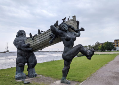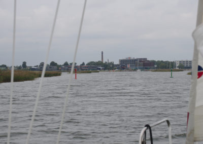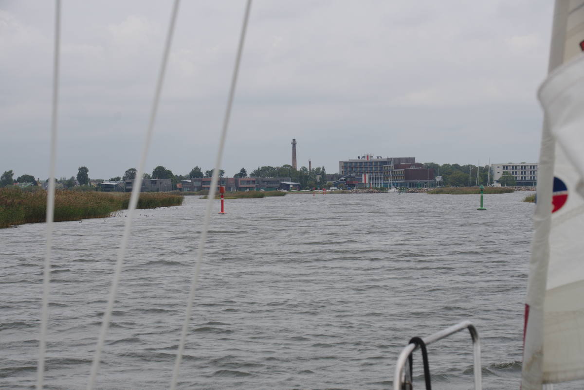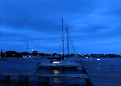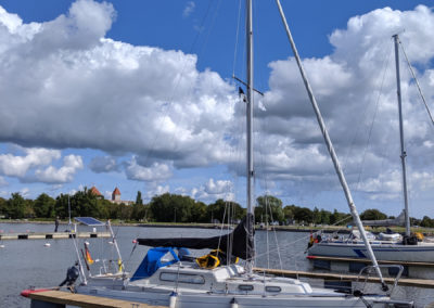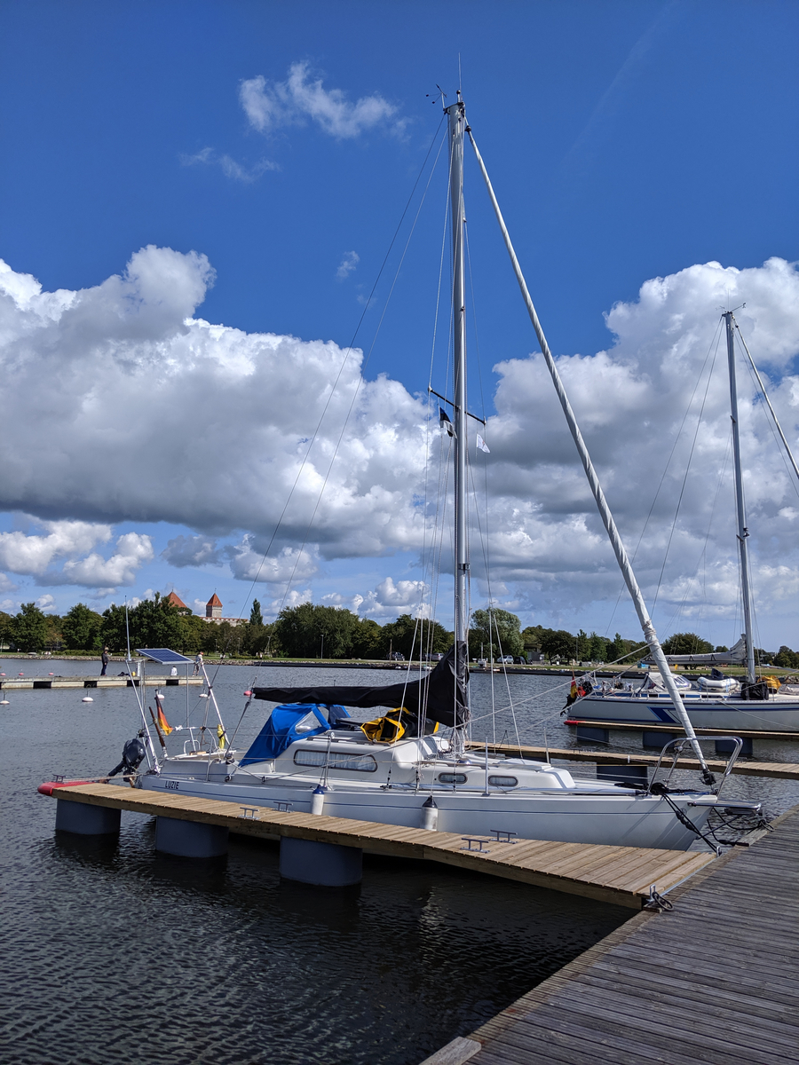 Am nächsten Tag segelten wir in neuer Höchstgeschwindigkeit nach Haapsalu. Der Wind war herrlich und wir genossen die Fahrt sehr. In unserem Geschwindigkeitsrausch erging es uns leider im Hafen von Haapsalu wie manchem Fahranfänger auf der Autobahnausfahrt. Wir bogen ungewollt recht schwungvoll in die Box ein, die zudem ungewohnt passend für unsere Bootslänge und damit ziemlich kurz war. Kaum hatten wir die rückwärtigen Poller passiert, da rumste Luzie schon unelegant vorn gegen den Holzsteg. Luzie passierte nichts, aber unsere Egos trugen leichte Kratzer davon und das weiche Holz des Steges einen Abdruck unserer Bugleiter. Vor allem aber jagten wir mit unserem Manöver der betagten Crew des Nachbarschiffes einen gewaltigen Schrecken ein und störten ihren Frieden nachhaltig. Die offenkundige Missbilligung der Herren machte uns das Bordleben in Haapsalu etwas unbehaglich.