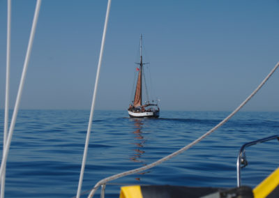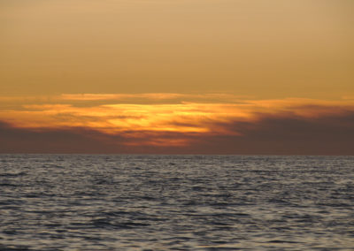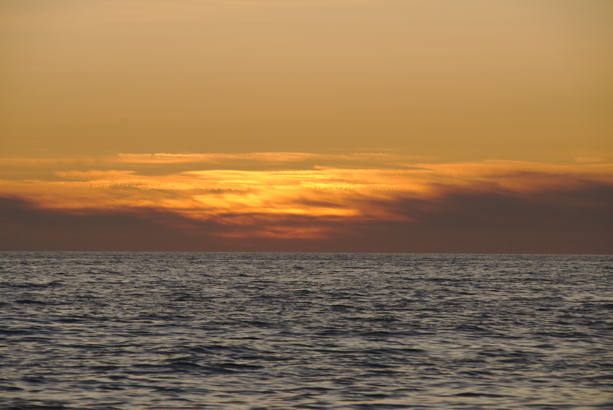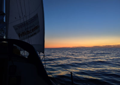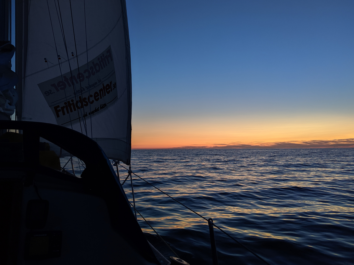 Gegen 15:30 Uhr konnten wir unseren Motor abschalten und Schmetterlingskurs segeln. Die Stille war eine Wohltat. Ab 18 Uhr schalteten wir den Motor wieder an, da wir unter Segel unsere selbst gesetzte mindest-Reisegeschwindigkeit von drei Knoten nicht mehr schafften, und begannen mit unserem Schichtplan für die Nacht. Miriam übernahm die erste Schicht am Steuer, aber Christian war es zum Schlafen noch zu früh. Als Christian um 20 Uhr übernahm, wollte auch Miriam noch nicht unter Deck ausruhen, denn das Abendlicht war zu wundervoll. Gemeinsam genossen wir noch eine Weile den Sonnenuntergang und schalteten Luzies Positionslichter und das Toplicht an der Mastspitze an. Dann legte sich Miriam noch eine Weile unter Deck, um Schlaf vor zu holen. Zum Ausruhen legten wir uns in dieser Nacht auf die Bank im Vorschiff, Stiefel und Jacke griffbereit, falls an Deck Hilfe gebraucht würde. Wir hatten warmen Tee und Linseneintopf vorbereitet und einen Naschteller mit Nüssen, Marzipan, Schokolade und Haribos, den wir bei Schichtende immer für den anderen nachfüllten. Da uns tagsüber der Außenbordmotor einmal ausgegangen war, weil wir nicht rechtzeitig nachgetankt hatten, beschlossen wir, nun strikt nach Zeitplan stündlich zu tanken, immer um Viertel nach.
