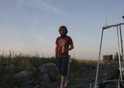 Ab 4:30 Uhr übernahm wieder Christian und segelte in den Sonnenaufgang hinein. Im ersten Dämmerlicht schlief Miriam zum ersten Mal in dieser Nacht richtig tief ein und Christian ließ sie ausschlafen. Die Zwei-Stunden-Schichten waren recht angenehm gewesen, wenn man am Steuer war, aber zum Ausruhen und Schlafen sehr kurz. Als Miriam aufwachte, stand die Sonne schon hoch und Gotland war bereits in Sicht. Wir hatten über Nacht segelnd an Höhe verloren und mussten nun vor der Küste nochmals kreuzen. Um 15:30 Uhr strichen wir die Segel und fuhren in den Sund ein, wobei wir von den seitlich einlaufenden Wellen kräftig durchgeschaukelt wurden. Um 16:15 Uhr Bordzeit legten wir in der kleinen Marina von Fårösund an. Ausnahmsweise gönnten wir uns am Steg ein echtes Anlegerbierchen. Anschließend stellten wir die Borduhren auf Ortszeit um eine Stunde zurück und spazierten noch eine Runde ins Dorf. Gern hätten wir uns noch ein Stückchen Kuchen gegönnt, aber das Café machte gerade zu. Stattdessen sind wir zurück in die Marina und nach dem Duschen früh ins Bett gegangen. Unsere Überfahrt hat gute 32 Stunden gedauert und wir haben dabei 114 Seemeilen (211 km) zurückgelegt.