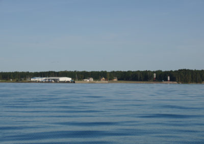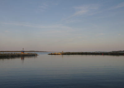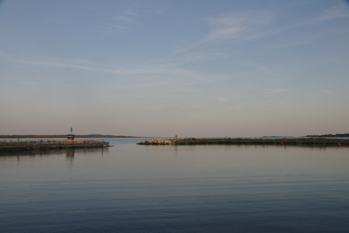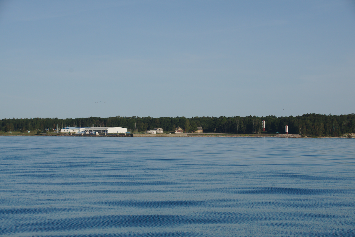 Unseren Absprunghafen Mõntu haben wir nur im Dämmerlicht gesehen. Wir hatten dorthin weite Strecken segeln können und die Anfahrt bei untergehender Sonne und aufflammenden Richtfeuern sehr genossen. Wir legten um 20:20 Uhr an und waren dem Hafenmeister dankbar, der uns natürlich herannahen gesehen hatte und extra länger im Dienst geblieben war. Da die Tankstelle defekt war, versorgte er uns mit 4l Benzin aus seinem eigenen Auto für günstige 5 €. Damit waren unsere Reservekanister wieder ganz voll und das gab uns ein beruhigendes Gefühl für die Überfahrt.