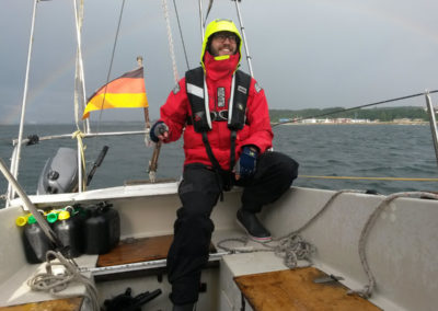 Bei der zweiten über das Cockpit spritzenden Welle rief Christian: „Ich würde sagen, wir kehren um. So wird das doch keinen Spaß machen, oder?“ Wir waren uns einig: „Klar machen zur Wende.“ Schon die Wende machte keinen Spaß, so groß war der Druck in den Segeln. Glücklicherweise waren wir noch nicht weit draußen und deshalb bald wieder zurück in der Abschattung vor der Küste. Kreidefelsen von der anderen Seite, eitler Sonnenschein und sanfter Seegang begleiteten unsere Rückfahrt nach Sassnitz.