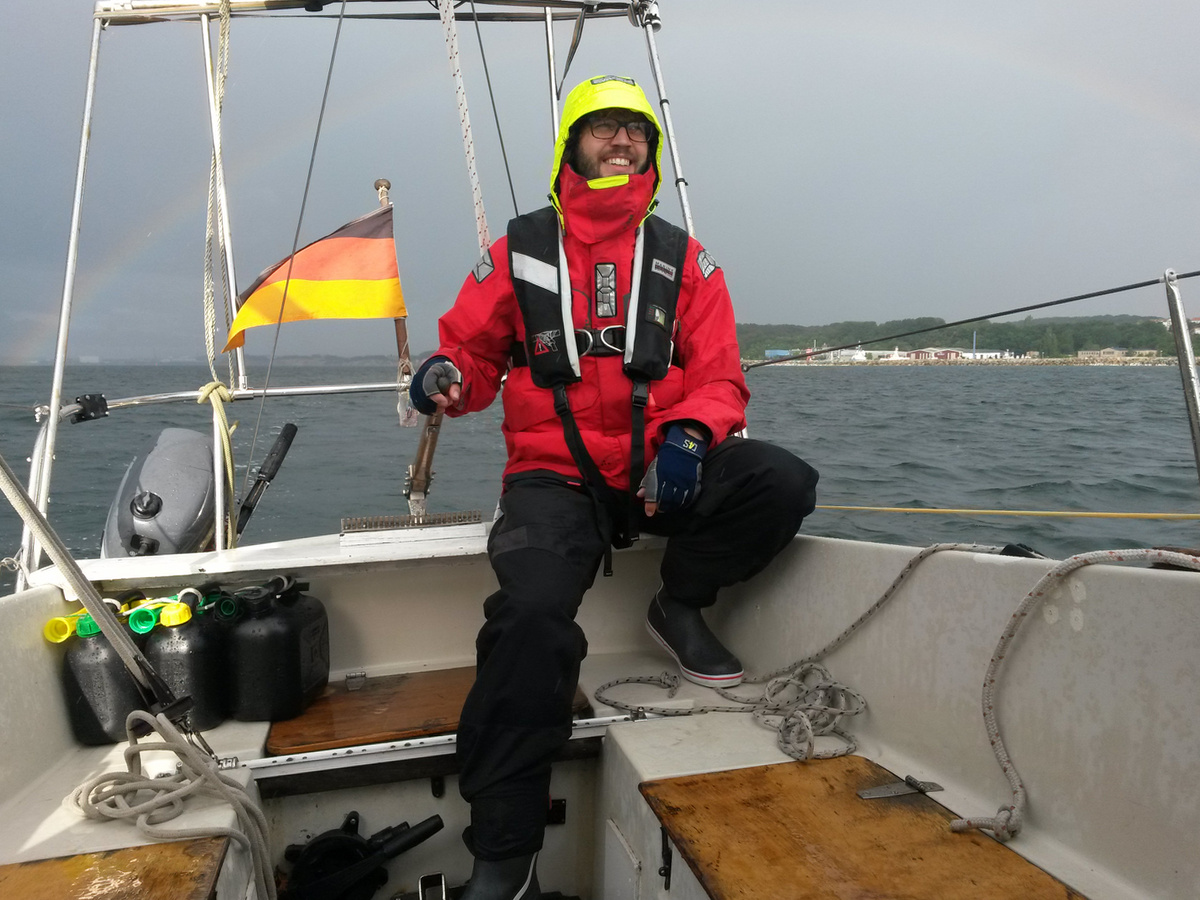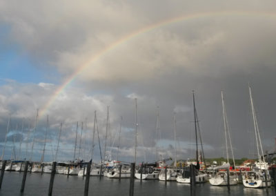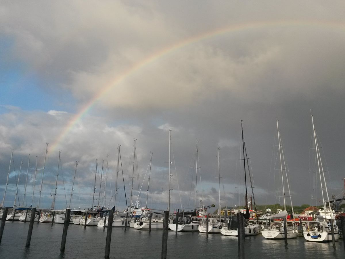 Für heute hatten wir uns vorgenommen, nach Bornholm zu segeln. Wir sind dafür um 5:15 Uhr aufgestanden. Der ganze Hafen schien noch zu schlafen. Regen und Kälte hätten auch uns fast wieder zurück in die gemütliche Koje getrieben. Aber eingepackt in die schwere Regenkleidung spürt man so ein bisschen Nässe ja kaum. Der Wetterbericht versprach Wind der Stärke 5 (frische Brise) bis 6 (starker Wind) aus für uns optimaler Richtung, um die Überfahrt in etwa 10 Stunden zu schaffen. Böen waren nur in einem der Windmodelle bis Stärke 7 (steifer Wind) gemeldet, was unsere selbst gesetzte Windstärkenobergrenze ist. Wellen bis zwei Meter Höhe waren angekündigt. Das hatten wir noch nicht erlebt und wir waren etwas skeptisch, wie es uns damit gehen würde. Aber wir fühlten uns vorbereitet für die Fahrt, hatten Essen vorgekocht und heißen Tee. Es stand ein vollkommener Regenbogen über der Hafenausfahrt. Unsere Abenteuerlust siegte.
