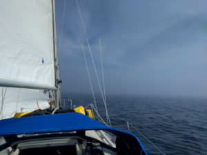 Wenig später erkannten wir an dem sich rasch nähernden Horizont, dass wir auf eine Nebelwand zufuhren. Nebel hatten wir auch morgens schon vom Hafen aus beobachtet. Die tiefliegenden, dichten Schwaden hatten sich morgens so überraschend aufgelöst, wie sie gekommen waren. Die nun vor uns liegende Wand verflüchtigte sich nicht. Laut unserem Reiseführer ist solcher Nebel ein häufiges Phänomen in der Hanöer Bucht. Für uns war es das erste Mal Segeln im Nebel. Nervös legten wir unsere Tröte bereit, schalteten AIS und Funk ein und zogen die Rettungswesten enger. Mit dem Eintauchen in die Nebelwand schien der Horizont sich um uns zu schließen. Wir hatten etwa 20 Meter Sicht in alle Richtungen, dahinter verlor sich das Wasser in grauem Dunst. Die Sonnenstrahlen wärmten kaum noch, aber wir sahen weiterhin blauen Himmel über uns. Wir lauschten und spähten in den Nebel, beobachteten die Geräte und gaben im Abstand von etwa zwei Minuten unsere Schallsignale: Einmal lang, zweimal kurz schallte unsere Tröte mit erheiternd unprofessionellem Klang über das Wasser. Abgesehen von einem sehr schnellen Motorboot und einem gerade noch sichtbarem Segelboot begegneten wir niemandem. Der Nebel lichtete sich nach etwa halber Strecke und wir legten in schönem Sonnenschein gegen 15 Uhr am felsigen Ufer von Tjärö an.